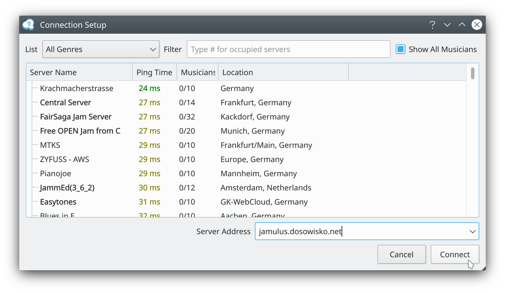 Gdy już skonfigurujesz Jamulusa, możesz połączyć się z naszym serwerem: